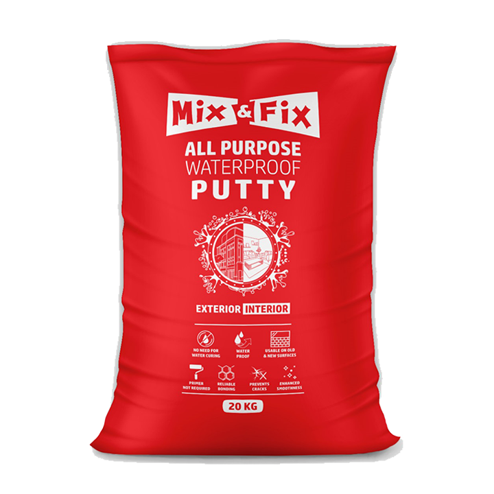 Mix & Fix All Purpose Waterproof Putty is a premium-grade, self-curing wall putty specifically designed to provide excellent results on both interior and exterior surfaces. This product can be applied on walls just 7 days after plastering and does not require water curing, saving you time and effort.